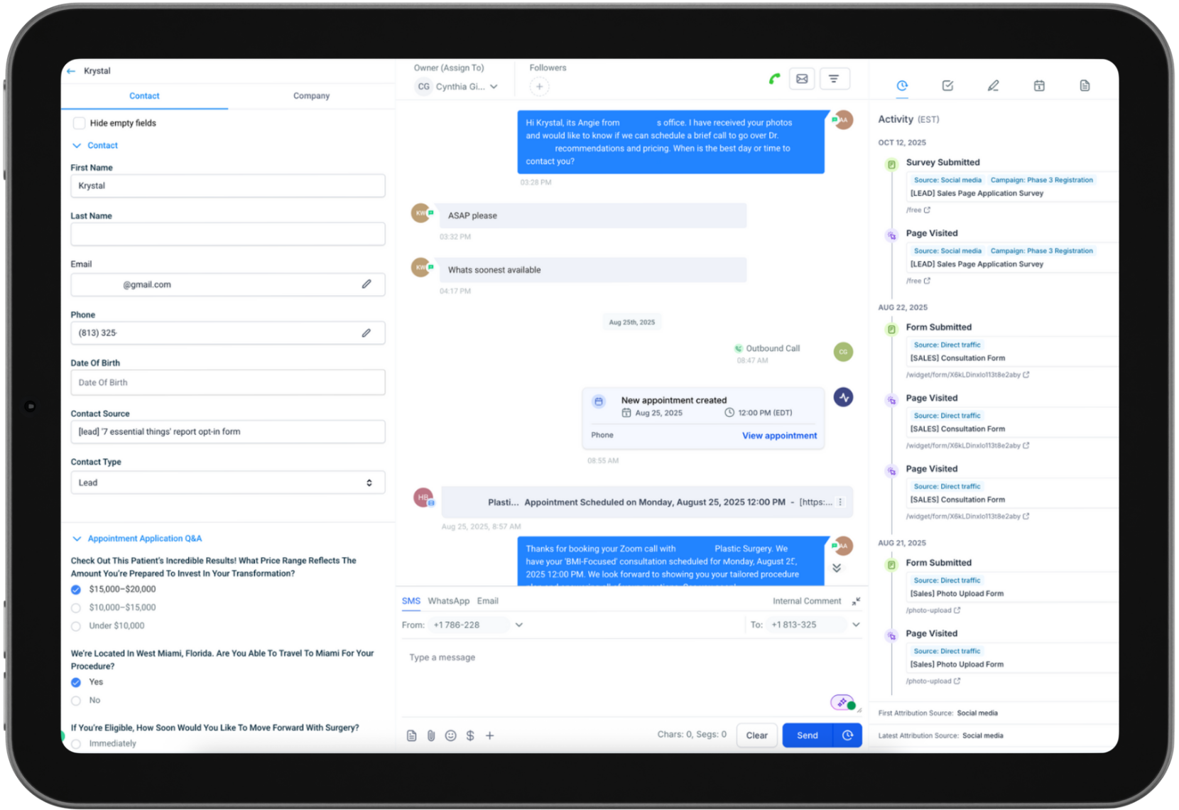 See Exactly What’s Working: Data, Compliance, And ROI. Know precisely how your marketing translates into revenue. Track response time, booked consults, and closed deals, all while keeping HIPAA-safe communication and total brand control.